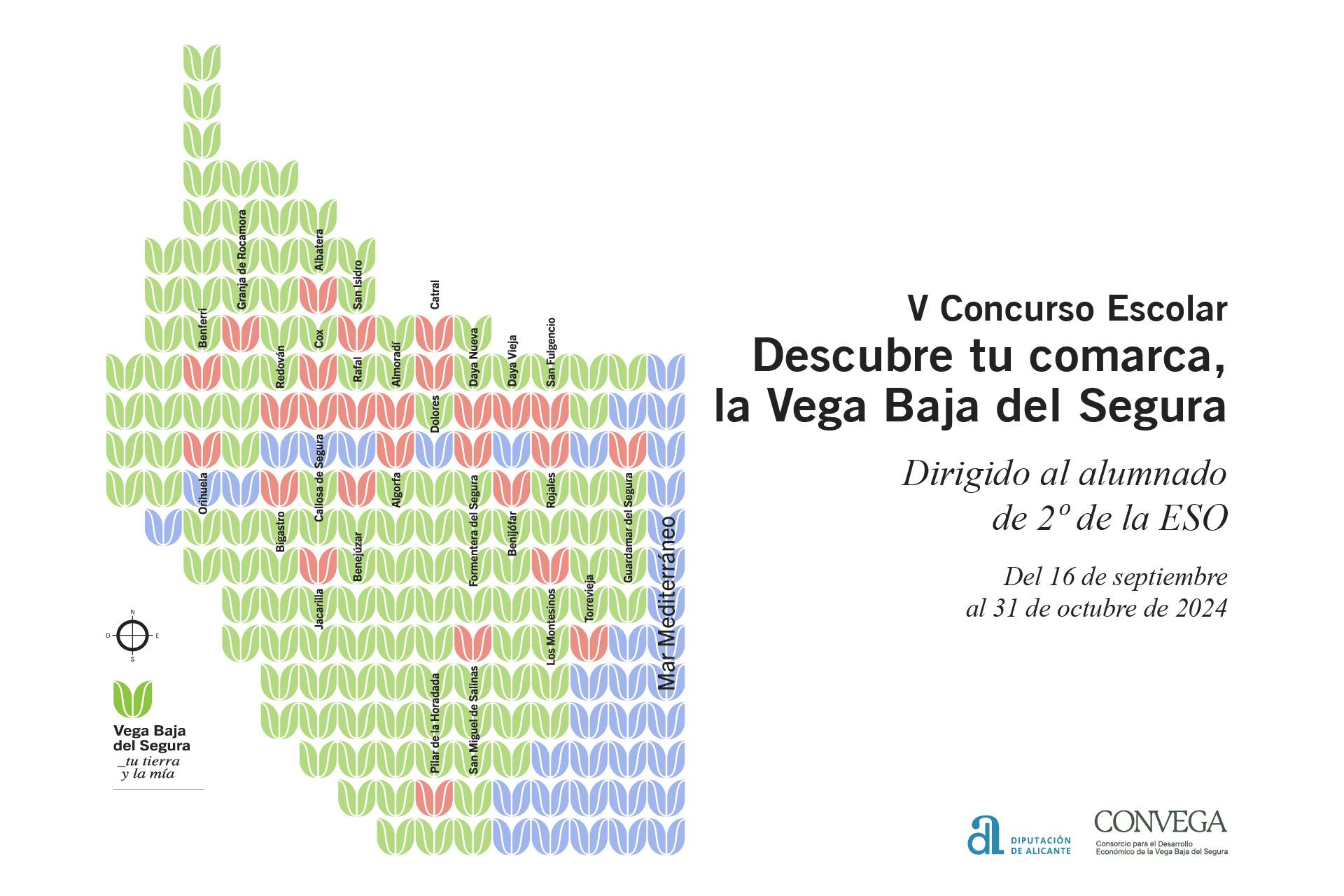 El Consorcio para el Desarrollo Económico de la Vega Baja del Segura (CONVEGA) pone en marcha la quinta edición del concurso escolar ‘Descubre tu comarca, la Vega Baja del Segura’ con la colaboración de la Diputación de Alicante. Esta iniciativa tiene como fin promocionar la marca territorio “Vega Baja del Segura_tu tierra y la mía” de una manera didáctica y artística entre el alumnado de segundo de la ESO de los centros educativos de la comarca.