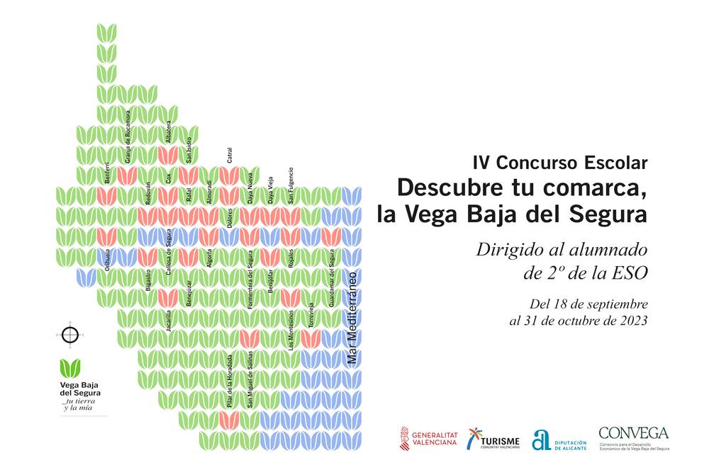 El Consorcio para el Desarrollo Económico de la Vega Baja (Convega) convoca el IV CONCURSO ESCOLAR: “DESCUBRE TU COMARCA, LA VEGA BAJA DEL SEGURA”, dentro del Plan Dinamización y Gobernanza Turística de la Vega Baja del Segura, desarrollado con la colaboración de Turisme Comunitat Valenciana y el apoyo de la Diputación Provincial de Alicante.